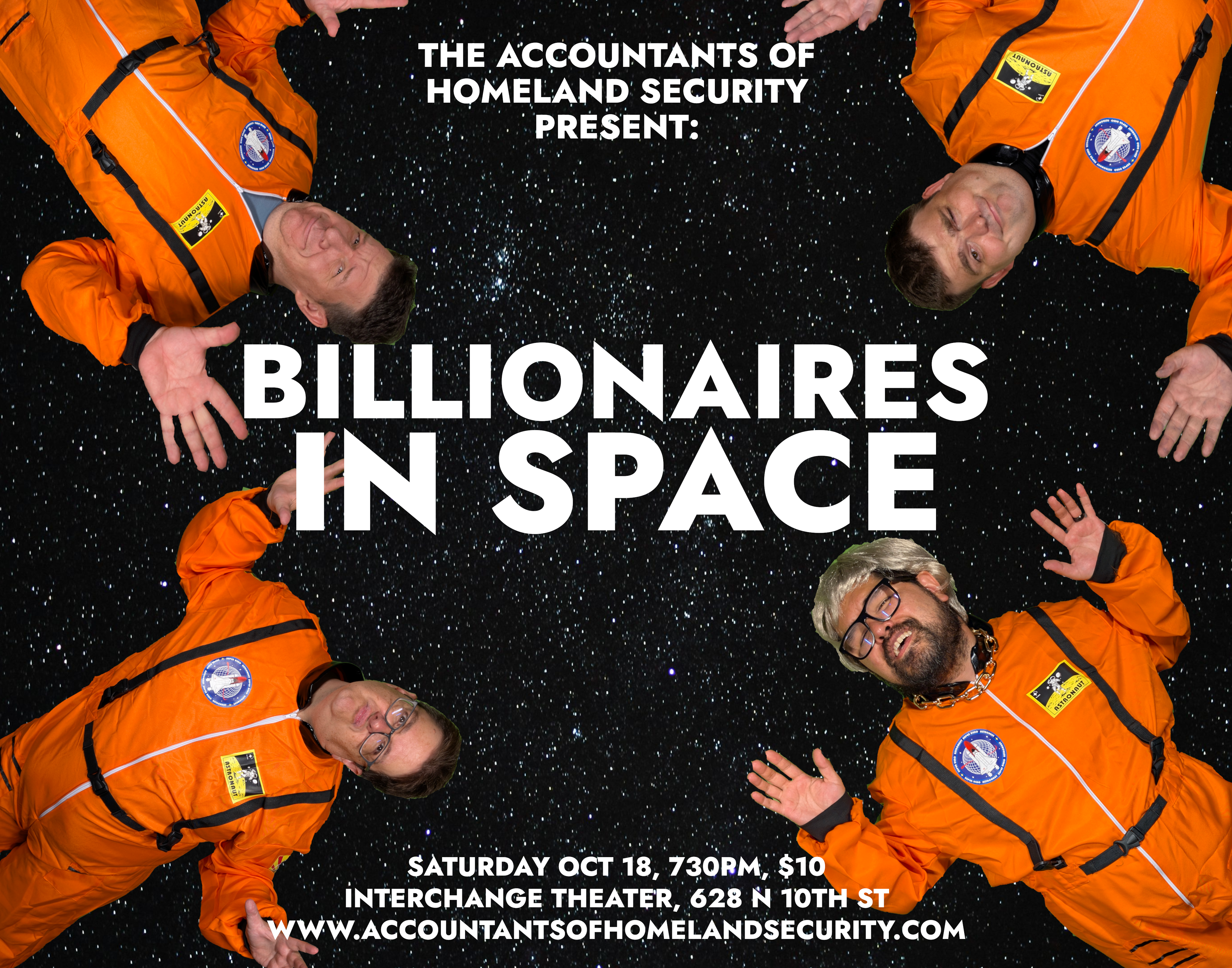 In Billionaires In Space, sketch comedy troupe The Accountants Of Homeland Security present a night of hysterical satirical sketches in which our nation’s oligarchs vacation off the planet Earth to escape the societal collapse caused by their greedy, selfish actions. This one-night-only multimedia show combining live comedy and pretaped video segments takes place October 18th at The Interchange Theater Co-op.