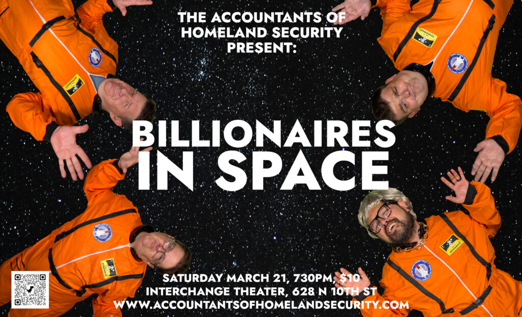 In Billionaires In Space, sketch comedy troupe The Accountants Of Homeland Security present a night of hysterical satirical sketches in which our nation’s oligarchs vacation off the planet Earth to escape the societal collapse caused by their greedy, selfish actions. This one-night-only multimedia show combining live comedy and pretaped video segments takes place March 21st at The Interchange Theater Co-op.